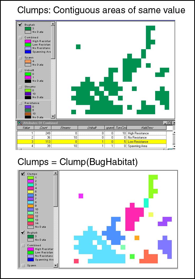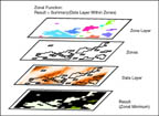 Values of cells in output reflect data values summarized within a particular zone in the input raster.(With associated recode and clump functions to re-arrange zones)