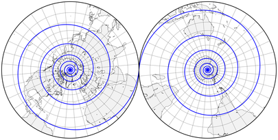 A loxodrome with bearing 292.5° passing through Campinas, Brazil, as represented on an oblique semitransparent azimuthal orthographic map and on a polar azimuthal stereographic map with two hemispheres.